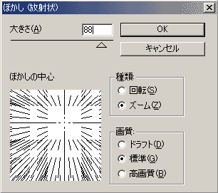 人物から描いて、背景までイメージが特に出来ていなかった場合は、ソフトについている機能をフル活用することで、作れてしまう背景にする場合が多いです。 まずは背景部分にあたる、アイボリー部分を選択範囲に指定する。 (選択範囲の詳しい使い方は、これまでの下地作りなどの記事を参照のこと) 背景用に新規レイヤーを用意する。 (背景レイヤーではなく、背景を描く用としての、新規レイヤー) 炎をイメージして、暗めの赤と明るいオレンジの2色をセレクト。 上のメニューバーからフィルタ→描画→雲模様1を選ぶ。 そうすると図のように、2色が勝手に交ざったモヤモヤっとした模様が出来上がる。 炎をイメージしているので、2色だけだと深みが足りないので、暗い色を更に加えてみる。 単なる真っ黒だと面白味がないので、少し青の入った黒にしてみた。 エアブラシ、乗算で筆圧の強弱も利用しつつ、適当に暗い部分も置いてみる。 髪の毛の動きと炎の動きが連動して、背景が少しうるさくなった気がしたので、少し違う趣向でも凝らしてみようかと方向変換した。 霧散させようと。 万が一失敗した時の予備のために、炎の背景用レイヤーを複製してとっておく。 メニューバーからフィルタ→ぼかし→ぼかし(放射状)を選ぶと、左下の様なウィンドウが出る。 ズーム88にして、顔の中心くらいから放射されるように設定してみた。(下左図) 左下の放射図(ぼかしの中心)が、画面全体をさしていて、放射の中心部分は初めは真ん中に設定されているが、マウスでクリックしたままドラッグすると、中心部を移動させることができる。 絵と放射図のにらめっこをしつつ、ぼかしの中心を鼻付近に中心部を移動…中央より少し右上のあたり。 絵の上で設定する訳ではないので、勘の世界。 OKを押すと、まるで爆発したかのように仕上がる。(下右図) 勢いは、大きさの数値を変えることで変わる。 一度では思うようにいかないことも多いので、何度か試して微調整をしつつ、最終決定をする。 選択範囲は設定したまま背景を処理していたが、外して現在の絵の完成度を見るなら以下。 顔に放射の中心を持ってきたことで、顔に視線が自然と向かうような…絵としてスッキリした画面になったかと思う。 |