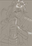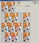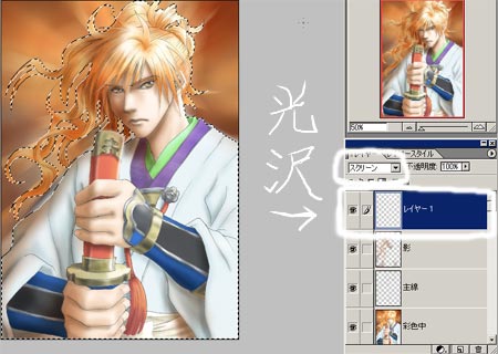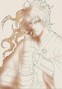人物全体に炎の色で影を入れ、光をも入れることで、画面全体の統一性とメリハリを一挙に解決しようと試みた。 先ほど背景を描くために作った選択範囲を反転する。 図の黄色い斜線部分が選択されたことになる。 その中に影を入れていくことになる。 新しいレイヤーを作り、レイヤー自体のモードを乗算にする。 光源を意識しつつ、赤とオレンジで影部分にエアブラシで色を置く。 下左図が普通に描き加えた所。 下右図はどこに色を置いたのか皆様が判りやすいように影部分だけ表示してみた所。 影で少し重くなった絵を、少しだけ軽く抜くために、光も全体に対してかける。 影レイヤーの上に、新しくレイヤーを作成。レイヤーモードをスクリーンに。 エアブラシを使って光部分に白色を置く。 下左図が、影の上に光を抜いた所。 下右図が、わかりやすいように、光のみを取り出した所。 これで、幾分勢いのある絵になりましたが、着物の模様を入れ忘れていたことに気づきました。 彩色レイヤーと主線レイヤーの間に、新しいレイヤー(服の模様)を作りました。 エアブラシで筆圧を利用しながら、うるさくならない適度―私の場合はあまりキッチリ描き込むのではなく、立体感を考慮し適度に抜きながら)―に描き入れる。 一通りの手を尽くし、仕上がったのが以下。 気紛れで、もう一手間かける気になりました。 赤い絵ってあまり描かないので、せっかくならば、全体に赤みがかった絵にするのも面白かろうと思って。 メニューから色調補正→バリエーションを選ぶと、以下のようなウィンドウが開きます。 原画が一番左上。 下には、規則に従って、加工された見本が並びます。 そこからお気に入りを見つけて、クリックをすることで手を加えられるのです。 原画の右横に、クリックで手を加えた状態の物が表示されます。 原画から少しだけ赤くするために、小大のレベルバーを小寄りにし、丸をつけたレッドの画像が気に入ったので、クリック。 OKを押すと、加工されます。 色々試すと、思わぬことになったりして、中々面白いです。 Phot Shop Elementsによる彩色はこれにて、完成!! |
