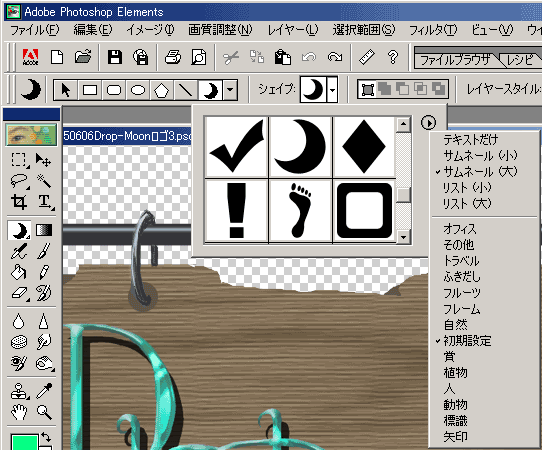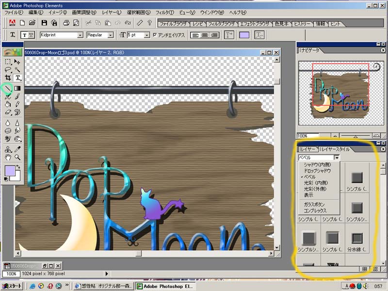 初めに、適当に描いた鉛筆書きのラフデザインを用意。 本当に練る事も無く、パッと思いついた字面です。 ただ、そのイメージをソフト上で形にするには大変でして。。。 イメージに近いフォントを変形させることで何とかなると初めは高を括っておりましたが、何度違うフォントで組み合わせてみても、イメージには程遠く。 「Drop Moon」の部分は、先ずは一色で凡そのラインを、Photo Shop Elementsソフト上+ペンタブで描いた後、肉を足したりはみ出しを減らしたり…と、地道にイメージラインへと近づけていきました。 原画では粗が見えるくらい…本来のフォントに比べれば汚さ満開でした。 多分加工で得をしております。 Photo Shop Elementsのレイヤーと同じ所には「レイヤースタイル」と言うものがあって、初めは気付かなかったのですが、便利さに気付いて最近多用しております。 今回は文字部分のレイヤーには「コンプレックス」の中の「波」と「ベベル」(立体的になる)の(記憶が曖昧ですが)「シンプルシャープ(内側)」、月や猫の部分も含めると「ドロップシャドウ」の「はっきりとしたエッジ」を利用しています。 要はその機能を上手く利用すると、一色で描いた物が、カラフルになったり立体的になったり、影が付いたりが簡単に出来るんです♪ 少し重たいです100KBありますが、参考までに。 Photo Shop LEにはその機能がついていた覚えは無いです。 最近LEはインストールしてないので、記憶の彼方ですが、同じフォトショップでも機能が制限されて違いますから。 文字にくっついている猫と月ですが、これも機能を利用しました。 黄緑色で囲った、左のツールボックスの「シェイプツール」です。(今見えているのはラインツールですが。) ここを選ぶと、その中に「カスタムシェイプ」というのがあり、その中に色んな形があるのですよ。 月型が見えているでしょう♪ シェイプと描いてある横をクリックすると、色んな形を選べます。 初めは「初期設定」の「足跡」や「月」などの形しかサムネールでは出ませんが、右横の三角矢印をクリックすると、更に色んなジャンルから形が選べるのですよ。 「動物」には「猫」も3パターンありまして、その内の一種類を使用し、レイヤーを「ラスタライズ」した後に、キャラ設定に合うように、シルエットに手を加えました。 その後「選択範囲」と「グラデーション」ツールを使って単色からカラフルな物へと変えました。 看板の部分は、今回は割愛しますね。 PR |