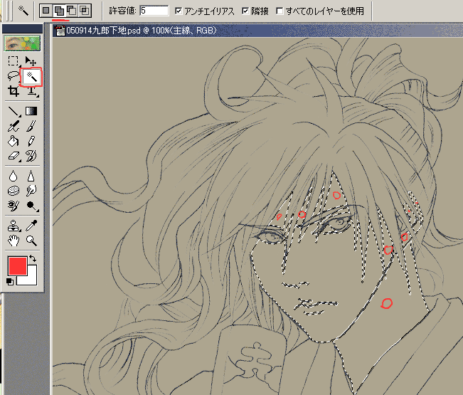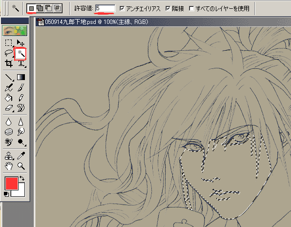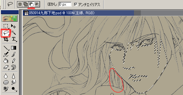 線画作りではスキャンしたままのサイズで作業してました。 彩色では作業しやすいように、また印刷用ではなくWEB用なので、それ程大きいサイズでなくても大丈夫なことから、少し小さくしました。 25%、50%、75%と言ったパーセンテージで小さくすると、結構綺麗なまま小さくなっていく気がします。 今回は、どのパーセンテージをかけたかは忘れましたが、横740X縦1055pixelになりました。 ■彩色内訳作り 引き続きPhoto Shop Elementsで作業。 Photo Shopのバージョンによっては、マスクを作る方が楽だったり、ツールのある場所が多少違うかもしれませんが、一つの参考になれば幸いです。 彩色内訳レイヤーを作ります。 絵柄によっては必要ないと思いますが、私は線が細かく、一度で本当に必要な部分が分けられないため、下地作業を必要とします。 おおよその配色が判るのと、その後の塗り作業をしやすくするためです。 (普段はこの作業はほぼ省略ですが、今回は他人様も塗って下さるのも考慮したためですが、これがあると勿論仕上がりも綺麗です。) 仮の地と線画レイヤーの間に、新しいレイヤーを作りましょう。 この時点でのレイヤーは、下から「仮の地」 「新しいレイヤー(彩色内訳)」 「線画」の順になります。 以下の画像を見て下さい。 左のツールボックスから選択範囲を押しました。 上の所にはまずは赤い下線を引いた通常タイプ 許容値5 アンチエイリアスチェック 隣接チェック すべてのレイヤーを使用にもチェック ((注)) *絵によって、許容値は様子をみつつ変えます。 より沢山の部分を選択したい時は数値を大きく、細かい選択をしたい時は数値を小さく。 例えば似たような色が3色あって、間が少し交ざってグラデーションになっている時、「1」を入れると、明確なクリックした一色だけが選ばれますが、「3」を入れるとグラデーションでボケている部分や、隣り合わせた色までが選択されます。 *画像ではすべてのレイヤー使用にチェック入ってないですが、この時点ではチェックを入れておいたほうが作業しやすいと思います。 そして、まず肌の範囲を分けてみようと思います。 ほっぺたの辺りなど、適当に1回クリック!! 塗ろうとしている範囲が選択されます。 そこまでがこの上の画像の状態。 ただ、よく見て下さい!! 余分な所まで選択されました。 向かって頬の左下の髪の毛まで範囲になってしまいました。 余分な範囲を減らします。 以下を参照。 選択範囲で埒があかない時は、自由度の高いなげなわが便利です。 ((注))もしかしたら最初は四角の選択範囲などになってますが、赤い四角で囲っている右下をよくよく見ると三角形があるんですが、そこをクリックすると他のツールが選べます。 他の部分にも見られる右下の三角は、この部分には「他のタイプのツールが一緒にまとまってますよ」と言うサインです。 クリックすると今まで気付かなかった便利なツールに出会えるかも!! 自由曲線で選べる画像と同じなげなわを選んで下さい。 上のボックスでは赤い下線の引いた、左から3番目の減を選んで下さい。 (左から、呼び方はともかく…普通・加える・減らす・合わさった所を選ぶ、となります。普通は一つの範囲しか有効になりませんので、もし普通のまま2箇所目をクリックすると、2箇所目が選択され、1箇所目は選択しなかったことになってしまいます) 余分に選択されていた部分を、画像内の赤丸のように囲います。 すると、余計だった髪部分の選択範囲が消えます。 次に、更に肌色の部分を選択していきます。 以下の画像を参照。 また選択範囲を使うのですが、上の作業欄に注目!! 一番左の通常でしたが、今度は追加(下線部)を押しました。 普通から加えるに替えたら、線画内の赤丸をつけた所を次々クリックしていきます。 その他、見えてませんが、手など肌色になる所も合わせてクリックして選択♪ 同じ色の範囲が選べたら、凡その肌色を左のパレット(画像では赤い所)をクリックして選ぶ。 彩色内訳レイヤーを選んでいることを確認。 メニューの編集→塗りつぶし 窓が出てくるので通常 100% OK 以下のように肌色ベースが仕上がりました。 ここまでのまとめ ・選択範囲 ・なげなわ 通常・加える・減らすを駆使しながら、同色部分を選ぶ。 凡その色を選んで、編集→塗りつぶし 最後の最後に鉛筆ツール100%で細部を塗りつぶし修正も可能 肌を例にしましたが、髪でも同様。 選択して(左)余分な所は減らしていく(右) 複雑な部分は、選択範囲よりなげなわを初めから駆使する方が楽な場合もあり。 部分ごとに繰り返していくと… マスク代わりの彩色内訳完成です。 PR |